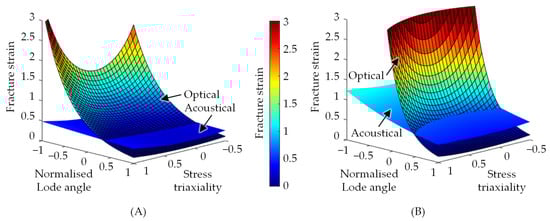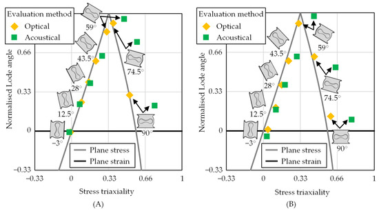Based on the determined developments, the characteristic values of the stress triaxiality and the normalised Lode angle were first calculated to create parameter sets for the parametrisation of the EMC fracture models. Therefore, the area-weighted centroids of the equivalent plastic strain–stress triaxiality and the equivalent plastic-strain-normalised Lode angle curves were calculated as proposed in [31]. For both evaluation methods and the seven loading angles, the area-weighted centroids are shown in Figure 11A for HCT980X and in Figure 11B for HCT780C. In the stress-triaxiality-normalised Lode angle plane, the differences in the stress states of both evaluation methods are more clearly visible. Loading angles up to 28° show a similar characteristic stress state for both materials, laying well on the plane stress state. For loading angles above 28°, the characteristic stress states from the acoustical evaluation method are shifted to higher stress triaxialities compared to the characteristic stress state from the optical evaluation method. This can be explained by the different stress states at different loading angles. At low loading angles, a shear stress state is present, which shows no gradient of the stress state along the sheet thickness of the butterfly specimen. An increase in the loading angle leads to a change in the stress state. A uniaxial tension or a plane strain tension state can be present. Here, a difference of the stress state regarding the stress triaxiality and the normalised Lode angle can be observed over the sheet thickness of the butterfly specimen. The different location of fracture of the two evaluation methods therefore leads to the differences in the characteristic stress states for higher loading angles.