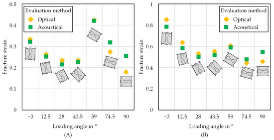 Second, the equivalent plastic strain at fracture was determined, which corresponds to the maximum of the equivalent plastic strain development. Analysing the equivalent plastic strain in Figure 12, the effect of the different evaluation areas can be seen well. Although the displacement from the optical evaluation method is almost the same as for the acoustic evaluation method, the maximum equivalent plastic strains determined by the optical evaluation method are above the equivalent plastic strains from acoustical evaluation method for loading angles up to 59° and below for higher loading angles. This tendency can be noticed for both materials.