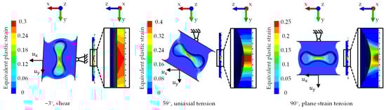 In order to verify the numerical models of the butterfly tests, the equivalent plastic strain of the models is compared to the equivalent plastic strain from digital image correlation in Figure 9, exemplarily for the loading angles −3°, 59°, and 90°. For the y-displacement at fracture, the equivalent plastic strain of HCT780C is higher than for HCT980X due to the differences in formability. The global distribution of the equivalent plastic strain for the numerical butterfly specimen corresponds well to the distribution from digital image correlation. Locally in the specimen centre (unity mark) of the specimen, the distributions of the equivalent plastic strain also fit well. Only at the loading angle of 59°, for HCT780C, the numerical values are slightly below the experimental ones. This can be explained by the high scatter of the displacement at fracture for this loading angle, which can lead to a scatter regarding the equivalent plastic strain as well. In general, the distribution of the equivalent plastic strain of the experimental butterfly specimen is reproduced well by the numerical models. Hence, the modelling is assumed to be realistic enough for further analysis.