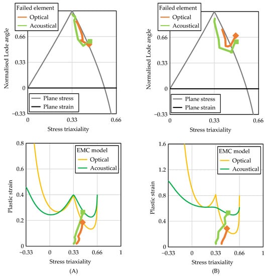 To analyse the fracture behaviour further, the development of the equivalent plastic strain, stress triaxiality, and normalised Lode angle was written out for one of the failed elements of the B-pillar. In the upper part of Figure 16, the development of the stress state is shown for HCT980X in (A) and for HCT780C in (B) for both fracture models. The stress state proceeds from the region of uniaxial tension along the plane stress state for both models as well as both materials and ends between the region of uniaxial tension and plane strain tension, at which point the element is considered failed. The lower graphs of Figure 16 show the equivalent plastic strain–stress triaxiality development of the failed element and the plane stress state of the EMC fracture models. It can be observed that the numerical simulations using the optical EMC models predict a lower drawing depth. Since the simulation models only differ regarding the fracture models, the difference of the failure prediction is grounded in the different appearance of the optical and the acoustical EMC fracture models. The fracture of the part is located in an area at which a stress state between uniaxial and plane strain tension is present. Here, the two EMC fracture models show a high difference in their slope (Lode angle axis). The optical EMC fracture model has a much lower slope than the acoustic EMC fracture model. Therefore, the predicted fracture strain from the optical EMC fracture model is lower than that from the acoustic model, especially at the present stress state. Factors influencing the fracture models and their appearance are mainly the data sets used for their parametrisation. Because of the steep slope of the optical EMC fracture model, the fracture in the B-pillar part is calculated much earlier compared to the numerical model using the acoustic EMC fracture model. Nevertheless, the stress state and equivalent plastic strain–stress triaxiality development for both fracture models are very similar. Hence, the investigations shown proved that the area of fracture evaluation—and therefore the correct fracture modelling—has a high impact on the numerical process design.
