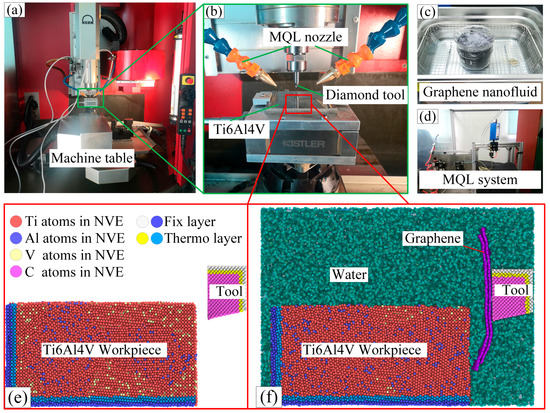 Experimental and simulation setup. (a) KERN-EVO machining center; (b) Machining platforms; (c) Graphene nanofluid; (d) MQL system; (e) Cutting simulation in a dry environment; (f) Cutting simulation in the graphene nanofluid.
