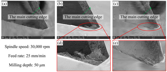 There are significant differences in structural form and dimensions between the single-edged micro-milling and traditional multi-edged tools. Criteria for evaluating the wear of micro-milling tools cannot be generalized. In this study, the contact area between the bottom face of the tool and the workpiece is the largest, and the most severe wear behavior is observed on the bottom surface. Therefore, the wear on the bottom face is only observed in subsequent analyses to determine the wear state of the tool. Figure 2 shows the wear morphology of the tool after machining 2000 mm under dry and graphene nanofluid conditions. The machining parameters are kept constant for both environments (spindle speed: 30,000 rpm, feed rate: 25 mm/min, depth: 50 μm). Although diamond tools are extremely hard and wear-resistant, wear behavior is discovered when machining difficult materials such as Ti6Al4V, as shown in Figure 2b. In order to observe the tool wear morphology more clearly, the wear area is enlarged, as shown in Figure 2d,e. The wear morphology under the dry conditions shows that the workpiece material adheres to the bottom surface of the cutter tool, i.e., adhesive wear. It is mainly due to the adsorption of workpiece atoms by the tool atoms under the coupling effect of high shear stress and mechanical heat [52]. During the micro-milling process, the tool face undergoes friction and compression from the chips and workpiece, resulting in tool scratching. More importantly, the depth of scratches on the tool is exacerbated by the hard points of the workpiece, which ultimately leads to abrasive wear of the tool. In addition to the adhesive and abrasive wear, micro-chipping is observed in the cutting area. The observed phenomenon deviates from the progressive wear pattern typically observed in traditional tools. Instead, it exhibits a distinct cliff-like formation of cracks and chips. This distinctive behavior can be attributed to the inherent characteristics of diamond tools, which are characterized by their hardness, brittleness, and low coefficient of thermal expansion.