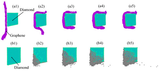 In order to examine the dynamic evolution process of tool wear suppression facilitated by graphene nanofluid, an analysis of the atomic-scale dynamic evolution process of tool wear was conducted using molecular dynamics, as shown in Figure 3. First, cutting simulation conditions were performed under graphene nanofluid. Next, cutting simulations were conducted under dry conditions to investigate the wear suppression effect of graphene nanofluid. The workpiece atoms and water molecules were removed to facilitate the observation of the tool atom wear process. The atomic structure of diamond tools is analyzed using the diamond structure identification method. The blue atoms represent the diamond structure, the purple atoms represent the graphene structure, and the gray atoms represent the amorphous C atoms. Figure 3(b1–b5) represents the morphology of tool wear under dry cutting at different cutting distances. The results show that although the hardness of the diamond is much higher than that of Ti6Al4V, the diamond still undergoes structural transformation behavior, i.e., tool wear. Similar results have been found in cutting other materials [53,54]. As the machining distance increases, the tendency of diamond structure atoms to transform into amorphous carbon is intensified. It indicates that the service life of diamond tools is also limited. The diamond C-C bond is broken under impact loading and mechanical-thermo-chemical reactions.