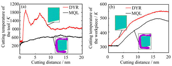 In addition, the average cutting temperature of the workpiece was also analyzed, as shown in Figure 4b. The cutting temperature in both working conditions showed an increasing trend with the increase in cutting distance. However, the cutting temperature under graphene nanofluid lubrication and cooling is much lower. This is mainly because the friction coefficient at the workpiece–tool interface is larger than the workpiece–graphene–tool friction coefficient, and the larger the friction coefficient, the more heat is generated. Excessive heat not only aggravates tool wear but also affects the steady state of the workpiece structure and the quality of the machined surface. Therefore, graphene nanofluid can effectively suppress tool wear and improve machining performance.