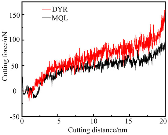 The magnitude of cutting force in machining has a great impact on machining accuracy, surface quality, and machining efficiency. The cutting force is influenced by several factors, such as cutting speed, feed, depth of cut, and material hardness. Generally speaking, the relationship between cutting force and speed is relatively complex [10]. In this study, cutting force variations during the cutting simulation were analyzed to investigate the effect of graphene nanofluid on cutting performance. Figure 5 shows the cutting force variation during the cutting simulation under two working conditions, where red represents the dry cutting simulation, and black represents the graphene nanofluid environment simulation. The cutting force shows an increasing trend with the increased machining distance in the dry condition. It indicates that the reaction force that hinders the tool motion gradually increases. Therefore, the increase in reaction force will further increase the pulling force of the workpiece atoms on the tool atoms, eventually leading to the breakage of the C-C bond. When the C-C bond of the diamond structure is broken, the hardness and wear resistance of the diamond decreases. Tool wear is more likely to occur as the wear increases. Therefore, diamond tool wear exhibits a non-linear increase with increasing machining distance during dry cutting. The cutting force at the same working condition decreases under the effect of graphene nanofluid. The cutting force was reduced from 160 nN to 102 nN. It indicates that graphene changed the contact properties between the tool–workpiece interface. The nanofluid acted as a lubricant between the friction interfaces. It is mainly because the interaction force of the Ti6Al4V workpiece atoms on the C atoms of the graphene structure is lower than that on the C atoms of the diamond structure. Therefore the pulling force of the workpiece on the tool is reduced. The graphene nanofluid relieves the C-C bond breakage of the diamond structure. In addition, the graphene structure is more chemically inert, and it is difficult for Ti6Al4V alloy workpieces to form a catalytic effect on it. Graphene inhibits the diffusion wear of diamond tools. Therefore, the cutting force is lower, and tool wear is suppressed under the graphene nanofluid.