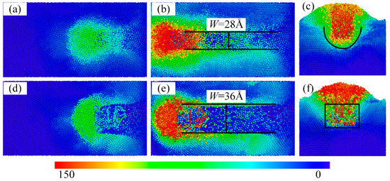 During the cutting process, shear and pressure are generated in the contact area between the tool and the workpiece, resulting in the removal of atoms from the surface of the workpiece. It can be seen from Figure 6a,b that the width of the cut groove under dry cutting conditions is approximately 28 Å. As the cutting distance increases, chips are accumulated on the front face. However, the cutting contour is not the same as the tool profile but has an irregular elliptical shape, as shown in Figure 6c. It is mainly because the chemical bonds between the workpiece atoms are not completely broken during cutting. Elastic recovery occurs after the tool has passed through. When graphene nanofluid was introduced, the cutting width increased to 36 Å. At the same time, we found that the cutting profile became more regular, as shown in Figure 6f. Therefore, the graphene nanofluid improves the material removal efficiency. Although the cutting efficiency per unit of time increases, the cutting force for the same working condition is less, as shown in Figure 5. The tool wear is lower, as shown in Figure 2. The results show that the graphene nanofluid improves the tool–workpiece contact characteristics, and the tool wear is effectively suppressed.