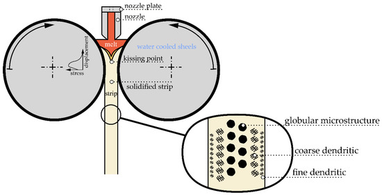 The TRC process combines the primary forming process (casting) with another forming process (rolling), and it differs in the vertical and horizontal process schemes. Thereby, it is divided by the direction of the strip flow, vertical or horizontal. The first variant was used in the present study. In special cases, TRC casters are used, which consist of shells with different diameters [15,16,17]. In simple terms, such a plant consists of a casting furnace, a nozzle system, a tundish, and a rolling mill. A simplified structure of a TRC plant with two equal shells is shown in Figure 1.