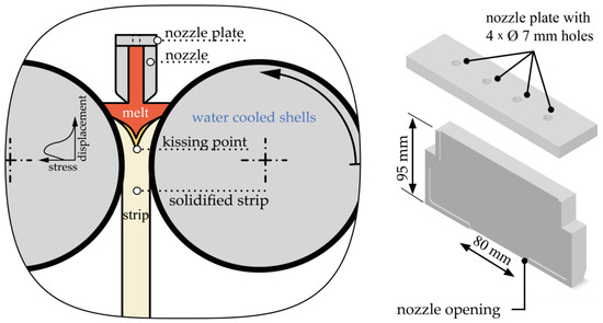 A vertical casting-rolling machine was used to process the AlSi10Mg [28]. The casting machine consists of two fluid-cooled rolling shells made of X38CrMoV5-3 with a diameter of 370 mm and a width of 200 mm. A glycol–water mixture is used as a cooling medium. A cooling medium flow rate of 2.4 m3/h was applied for the investigations. The roll temperature at the beginning of the trial was 15 °C. A resistance furnace with a bottom outlet and a power of 2.8 kW is used to melt the AlSi10Mg ingots. The melt is poured at a temperature of 635 °C via the tundish, which is equipped with a nozzle plate, into a distribution nozzle. At the opening of the nozzle, the melt had a maximal temperature of 589 °C. The nozzle plate and the nozzle were milled from calcium silicate plates. The remaining dimensions are shown in Figure 2, which contribute significantly to the formation of the later strip. The melt introduced through the nozzle then enters the 0.9 mm-wide rolling gap, where a quasi-simultaneous primary forming as well as forming process is performed.