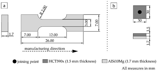(a) Geometry of the tensile test specimen and (b) geometry of the joint sampling specimen according to DVS (German Welding Society) guideline 3480-1 [30].