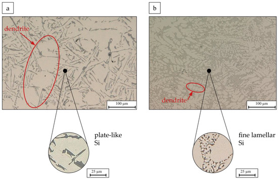 Figure 4 shows the difference in the microstructure of the AlSi10Mg manufactured by sand casting (a) and TRC (b). As a comparison, we use the results of our previous study by Neuser et al. [12]. In this study, the experimental design of the sand casting trials is also explained in detail. Remarkably, the AlSi10Mg processed in sand casting (a) shows the typical microstructure, i.e., a coarse plate-like Si eutectic, of a non-refined, hypoeutectic AlSi alloy. Due to the coarse and plate-like structure of the eutectic, ductility is low [32]. In sand casting, only moderate solidification rates of about 4.4 K/s are achieved with a component thickness of 2 mm [12]. In comparison, the microstructure shown in (b) is clearly different due to the processing via TRC. The dendritic structure of the α-aluminium is visible. In addition, there is no plate-like Si eutectic here, but a very finely separated, lamellar, and partially spherical Si eutectic. As a result of the process-specific solidification rates, there is a difference in the microstructure, which is also shown in the studies of Talaat et al. [25] and Fredriksson et al. [27]. However, as mentioned above, fast solidification suppresses the primary formation of a plate-like Si eutectic, as the Si cannot solidify on the AlP particles but solidifies without forming a plate-like morphology [25,27]. The formation of plate-like Si results in a decrease in ductility [32].