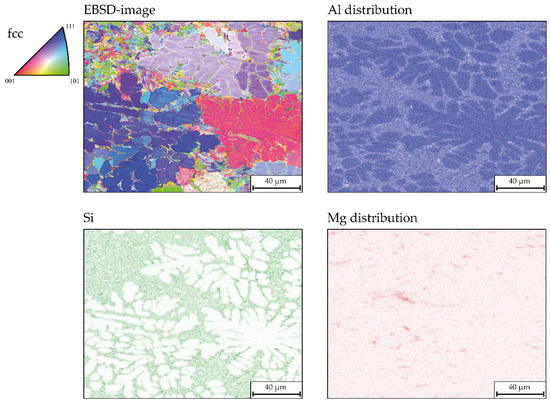 In addition, EDX analyses were carried out for the main elements Al, Si, and Mg. As expected, Al is found in the α-phase of the dendrites as well as in the eutectic. The EDX image of the Si particles illustrates the already discussed refinement-like morphology of the Si eutectic due to the high solidification rate without the use of refining agents. A large part of the Si eutectic is present as a lamellar to spherical morphology.