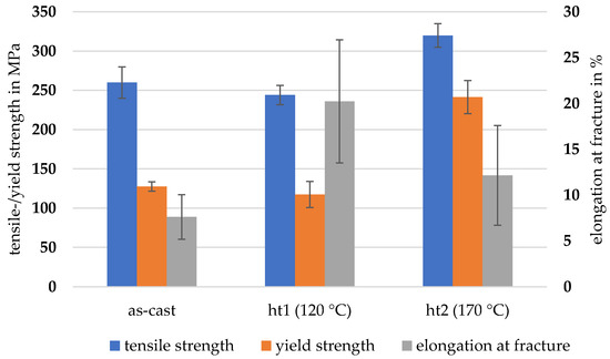 The mechanical properties of the specimens produced under different conditions in the TRC process are shown in Figure 6. There was a 6.5% difference in tensile strength between the as-cast and the ht1 condition. However, the elongation at the fracture could be increased by 2.7 times. In comparison, an increase in elongation at the fracture of 59.8% was determined between the as-cast and the ht2 conditions, and the tensile strength increased by 23.1%. The highest possible elongation at fracture should be aimed for in the subsequent mechanical joining. According to DVS guideline 3420, a suitable elongation at fracture for clinching is at least 12%; for the ht1 condition, the threshold value is achieved [35]. Furthermore, a yield strength ratio, the quotient of yield strength and tensile strength, of less than 0.7 is recommended for clinching suitability. In the as-cast and under the ht1 condition, the limit value is achieved at 0.49 and 0.48, respectively. Under the ht2 condition, however, the limit value of 0.75 is slightly exceeded. Thus, material condition ht1 can be classified as well-suited for clinching according to DVS guideline 3420. In contrast, material condition ht2 can only be described as partially suitable for clinching (cf. [35]).