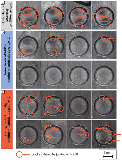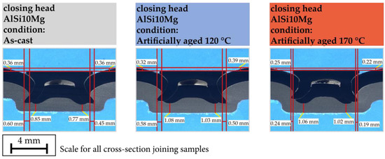 As detailed above, the high solidification rate leads to increased mechanical properties, which in turn significantly determine the joining suitability of the material. To evaluate the increased joining suitability due to a finer microstructure, the closing heads of SPR joints were examined for cracks. For this purpose, Figure 8 shows a large number of closing heads for the three material conditions. Although a yield tensile strength ratio of 0.49 could be determined for the as-cast condition, cracks were detected in all locking heads. An increase in yield strength was achieved compared to sand casting due to the high solidification rate, though the elongation at fracture of 7.6% is insufficient to allow crack-free joining.