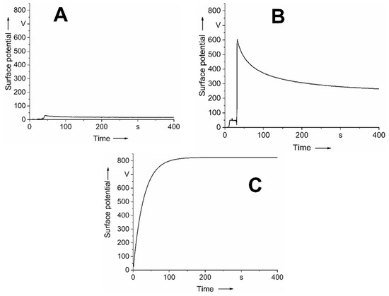 Surface potential of a charged polypropylene (PP) powder layer in case of (A) gas discharge-based powder charging with a charging voltage below 4 kV, (B) gas discharge-based powder charging with a charging voltage of 5 kV, and (C) triboelectric powder charging; surface potential measurements were conducted using an electrostatic voltmeter (Monroe 244A, Monroe Electronics Inc., Lyndonville, NY, USA) with a measurement accuracy of 0.1% at a separation distance between the probe and the powder bed surface of 3 mm.