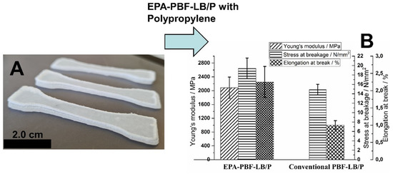 (A) Polypropylene (PP) tensile test specimen generated by EPA-PBF-LB/P, (B) mechanical properties of the tensile test specimen shown in (A) (error bars indicate standard deviation of 3 measurements; values for conventional PBF-LB/P from [36]); all images are property of Bayerisches Laserzentrum GmbH and were first published in [32].