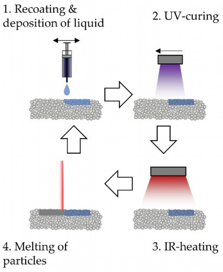 The FJ process combines two powder-based AM processes: laser-based powder bed fusion of plastics (PBF-LB/P) and binder jetting (BJT). Applications lie in the field of hard–soft structures, smart structures, and the introduction of secondary material properties, like thermal and electric conductivity. Also, graded transitions between the materials can be achieved. Figure 3 shows a schematic representation of the steps of the FJ process. The process starts with the initial recoating of a new thermoplastic powder layer, followed by the selective deposition of the liquid photopolymer. After that, the photopolymer is cured with a UV lamp and the surface temperature of the powder bed is subsequently increased with infrared lamps. Once the desired surface temperature is reached, a CO2 laser is used to selectively melt the thermoplastic powder. The first investigations were conducted to analyze the curing behavior and the thermal stability of acrylate photopolymers with the subsequent modeling of the curing kinetics [47,48]. Subsequent investigations [49] demonstrated that the infiltration behavior of acrylate photopolymers within a thermoplastic polymer powder bed was highly dependent on the surrounding temperature and could be mathematically approximated through an evolved version of the Washburn equation [50]. The bulk density was proven to have a low impact on the infiltration speed. Instead, the choice of material (comparison between PA11 and PEBA), as well as the packing conditions of the powder regarding the manufacturing process of the powder feedstock (grinding vs. chemical precipitation), was proven to have a high impact on the infiltration speed. For the acrylate photopolymers analyzed, no signs of unwanted curing have been detected at temperatures above 100 °C, with respective infiltration times below 500 µs. Also, the dynamic mechanical behavior of photopolymers blended with non-melted thermoplastic powder was characterized, demonstrating a decrease in the mechanical properties with increasing powder content within the thermoset matrix [51].