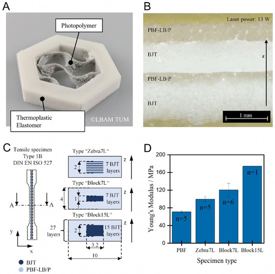 (A) Complex multi-material part combining thermoset photopolymers and thermoplastic elastomers, (B) transition areas between thermoset photopolymers and thermoplastic elastomers for a constant laser power. (C,D) different tensile specimen designs and effect of the specimen types on the Young’s modulus (all images are property of the Professorship of Laser-based Additive Manufacturing and were first published in [52]).