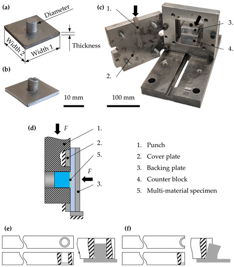The experimental setup used in this investigation is depicted in Figure 5. It is an adaption of the set-up presented in [54], where it is used for AM parts composed of a titanium sheet and an additive structure (Figure 5a,b). The specimens were clamped between the cover plate and the backing plate to prevent movements in the axial direction of the cylinder. Clamping forces were set to be low enough to not create friction between the specimen and the punch. With the cylindrical functional elements placed in the hole of the punch, a Z10 universal testing machine from the company ZwickRoell was used to move the punch downward with a constant speed of 1 mm/s, shearing the cylinder of the sheet. This machine offers a maximum force of 10 kN, which is beneficial for polymer parts due to the high resolution at lower force levels. The hardened punch allows for testing materials with higher strength, e.g., steels and other metals. Unlike polymer parts, metal parts usually require a testing machine with higher maximum forces, which is why the tests with the titanium parts were performed with a model Z100 from the company ZwickRoell with a maximum testing force of 100 kN. The specimens were sheared until a drop in force indicated failure in terms of crack formation and propagation. The applied force and the traveled distance were recorded and could be used to determine the shearing force and stress. In contrast to prior investigations with this set-up [54] (Figure 5f), the punch geometry was adapted to reduce the tilting of the cylinder during testing to a minimum, leading to an almost ideal shearing stress in the joint between the sheet and functional element (Figure 5e). Moreover, the specimens had a “sheet” with a 20 mm × 20 mm surface and cylindrical functional elements with a diameter of 5 mm and a height of 5 mm. The quadratic shape of the “sheet” was used to prevent deformations in it due to local stresses. Further information regarding the specimen design is described in the next section. The set-up offers a precise analysis of joint strength for hybrid and multi-material parts with a reduced amount of preparation. Moreover, further adaptions to the tools can be easily made due to the modularity of the setup. It is, therefore, possible to test parts with different diameters, sheet thicknesses, and even shapes of the functional elements.