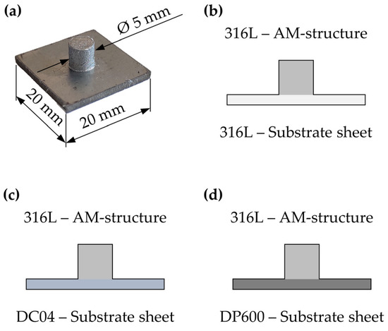 Based on the descriptions in Section 3.1, specimen designs for metal multi-material samples were derived, which are depicted in Figure 6, and processed with PBF-LB/M for future use in hybrid AM and vibrational microfeeding (compare with Section 2.2). The specimens consisted of square sheet metal with a side length of 20 mm. The austenitic stainless steel 316L (1.4404), the deep-drawing steel DC04 (1.0338), and the dual-phase steel DP600 (1.0941) were used as the substrate sheets, as shown in Figure 6.
