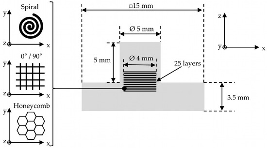 Based on the descriptions in Section 3.1, specimen designs for polymer multi-material samples were also derived, which are depicted in Figure 7 and were processed by the FJ technology (compare with Section 2.4). The parts combined acrylate photopolymers (UV DLP Hard, Photocentric 3D, Peterborough, UK) with TPU (TPU 1301, EOS GmbH, Krailling, Germany). The materials are referred to as acrylate photopolymer and TPU throughout this investigation. The individual material values of the respective components can be found in Table 1. Four different sample types were created: reference samples consisting of sole TPU, as well as reinforced samples with different photopolymer geometries in the transition area. The goal was to generate informational output concerning the impact of the different bonding geometries on the interlaminar connection. Before processing, a photopolymer infill of 50% was mathematically generated within the circular cross-section of the sample cylinder with a diameter of 4 mm. For the calculations, a line width of 0.3 mm of the photopolymer was assumed. As can be seen in Figure 7, a spiral pattern, an alternating rectangular pattern with 0°/90° orientation, and a honeycomb pattern were used for cross-sectional photopolymer reinforcement. All lines were created continuously, only resulting in overlaps for the 0°/90° pattern at the intersection points. The material ejection over 30 s was targeted at 250 mg for uniform results. All other processing parameters are summarized in Table 2. The processing sequence followed the process steps presented in Figure 3. Therefore, after the recoating step, every reinforced layer was injected with photopolymer first, followed by complete laser-based material processing of the whole cross-section. All samples of one type were printed at the same time.