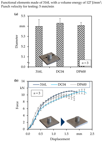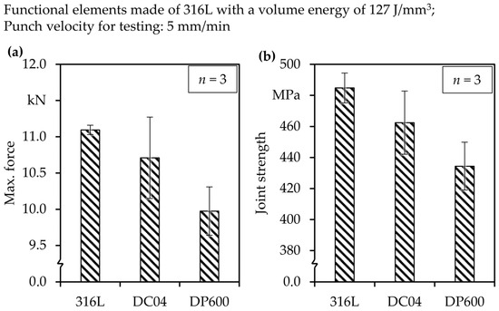 As the same powder and PBF-LB/M-parameters were used for the manufacturing of the functional elements, the diameters showed no differences (Figure 8a). The rough surface, which could be attributed to the sintered parts on the surface of PBF-LB/M-parts, led to an increase in size. The real diameter of the parts was 0.4 mm bigger than the designed 5.0 mm. These diameters could be used to calculate the present stresses during testing by dividing the applied force by the area of the cross-section. The forces for each of the material combinations during formation are shown in Figure 8b. The curves showed the same trends, beginning with a rather soft increase, followed by a steeper slope, and a decreased slope until the force decreased at the fracture. The beginning of the curve was characterized by the setting procedure, including the flattening of the mentioned particles at the surface of the parts. The subsequent increase in slope was attributed to the elastic deformation of the functional elements, followed by the plastic deformation (reduced slope). In the end, the force decreased when the plastic deformations were too high and the material tore at the joint. When comparing the different material combinations, certain differences were visible. The parts made with a DP600 substrate sheet material showed the steepest slope during the elastic phase of the shearing test, which was caused by it having the highest strength of the three materials. In addition to that, the slope of the other two materials decreased according to their strength. The lowest strength was found for DC04 and 316L lied between them. However, during the plastic deformation phase of the shear test, the increase in force was highest for 316L, which could be explained by the high strain-hardening potential of the material. The lowest displacements at fracture were found for DP600. The assumed reason for this was its lower ductility compared with the other two materials, which led to a lack of deformation before fracture. Supporting this finding is the fact that the highest displacement was found for DC04, which had the highest ductility of the three materials. In terms of comprehensibility, the maximum forces and resulting stresses are shown in additional diagrams in Figure 9.