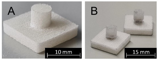 Figure 10 shows the polymer-based multi-material specimen before and after testing. It can be seen that the part failure was not complete. Instead, the cylinder was only partially detached from the base plate of the specimen. Analysis of the fracture zone indicates that the failure occurred within the photopolymer-reinforced layers of the part.