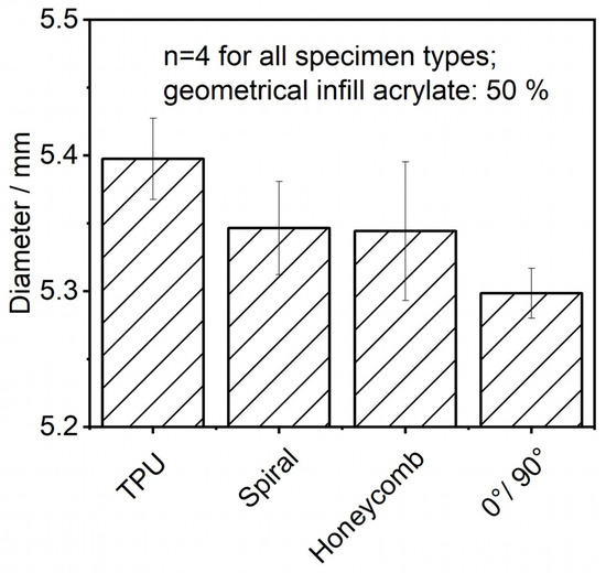 Before each test run, the diameter of all samples was determined for the determination of the shear strength. The results can be seen in Figure 11. All samples had a slight increase (approximately +0.4 mm) compared with the originally intended geometry of the cylinder diameter. Only mild variations were detectable for all specimen types with the highest deviations for the honeycomb specimen.