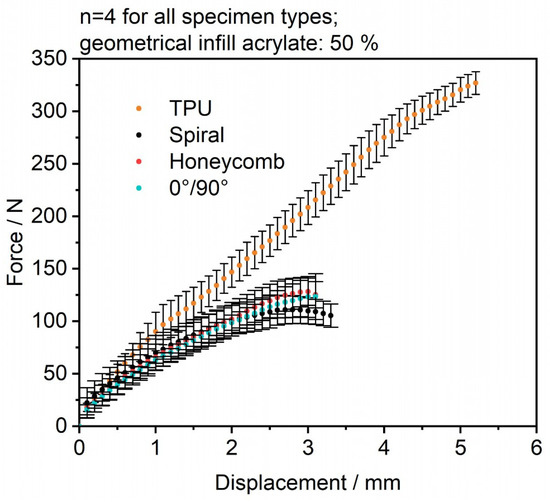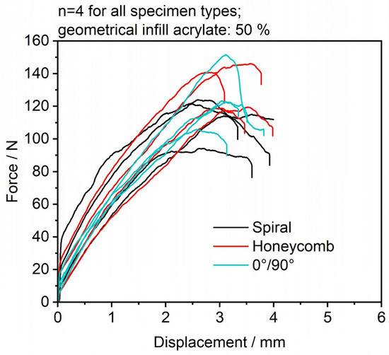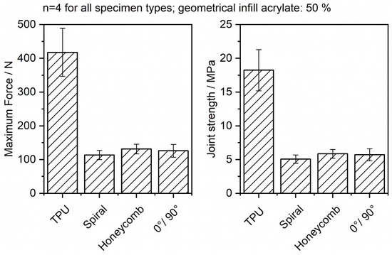 To better understand the effect of reinforcement on the specimen shear failure, Figure 13 breaks down the individual progressions of the measured forces over the traverse distance for all photopolymer-reinforced specimens. The honeycomb specimens showed the highest force values compared with the 0°/90° specimen and the spiral specimen, while the spiral specimens had the lowest mechanical values, but achieved the most stable results. The highest fluctuations in material failure were visible for the 0°/90° specimens, which could be potentially correlated to the induced overlaps of the photopolymer lines during processing. Even partial failures were detectable in single cases. In Figure 14, the maximum force values, as well as the resulting maximum shear stress values, are visible. The maximum values and standard deviations are present for the reference samples, while all reinforced specimens showed lower variation regarding their maximum values. The honeycomb reinforcements comparably showed the highest maximum values for the force and stress values of all reinforced specimens. This can be taken as a first step toward future process optimization, as the results indicate that alternative or combined reinforcement patterns could be utilized to counter interlaminar delamination. In future research, multi-material shear samples created with electrophotographic powder deposition will be analyzed and compared.