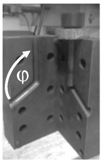 The ECAP specimens were cylindrical billets measuring 11.87 mm in diameter and 65.88 mm in length. The ECAP process involves inserting the specimens into dies through a special channel with an intersecting angle of 120°, as shown in Figure 1. During the ECAP process, the specimens were heated to a temperature of 300 °C while applying a pressure of 2500 kN. The process was repeated for two, six, and eight passes. In the subsequent repetitions, the specimens underwent a change in direction compared to the previous process, following route Bc, where the billet was rotated in a clockwise direction by 90° to the longitudinal axis between consecutive passes.