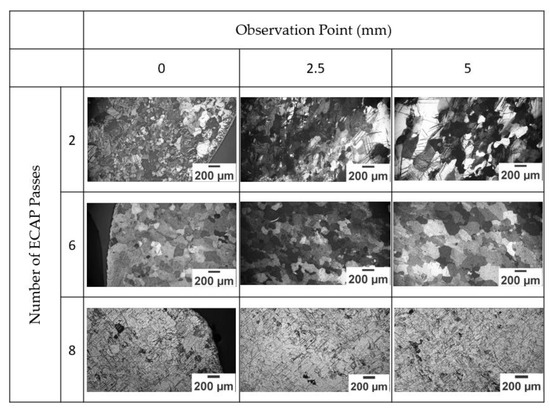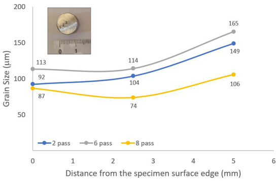 Upon examining the grain size distribution resulting from the ECAP process, it becomes evident that there are variations in grain size observed in the outer, middle, and central regions of the specimens corresponding to 0, 2.5, and 5 mm distance from the specimen surface edge, as depicted in Figure 7. Despite undergoing multiple repetitions of the process, the distribution of grain sizes remains heterogeneous, and coarse grains persist. Notably, the grain size in the outer region of the specimen appears finer due to displacement against the die wall during the ECAP process. Conversely, the central region exhibits the largest grain size, indicating a relatively lower strain experienced and longer storage temperature by this part of the specimen. With an increasing number of passes, the level of heterogeneity diminishes.