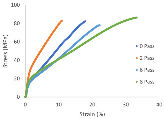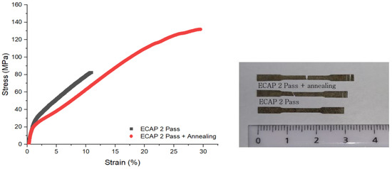 The stress-strain curve of the specimens resulting from the ECAP process.