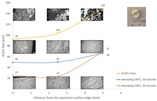 Annealing was conducted on the ECAP two-pass specimens. As seen in Figure 10, the grain size distribution at the surface edge, center, and core, corresponding to 0, 2.5, and 5 mm distance from the specimen surface edge, is shown. The grain size distribution of the ECAP two-pass specimens, as well as the ECAP specimens annealed at 200 °C and 250 °C for 30 min, can be observed in the figure. The annealing process on the ECAP two-pass specimens at 200 °C resulted in an average grain size of 56 μm (at the surface edge 50 μm, center 50 μm, and core 67 μm) and a more homogeneous microstructure. On the other hand, annealing at 250 °C produced finer grains, with an average grain size measuring 39 μm (at the outer 25 μm, middle 25 μm, and inner parts 68 μm), but with less homogeneous distribution in each part. The heterogeneity in grain size and distribution in materials is one of the factors that cause scattering in materials and microforming products due to the size effect. Homogenization can be improved with temperature and time, but it will decrease if grain growth occurs.