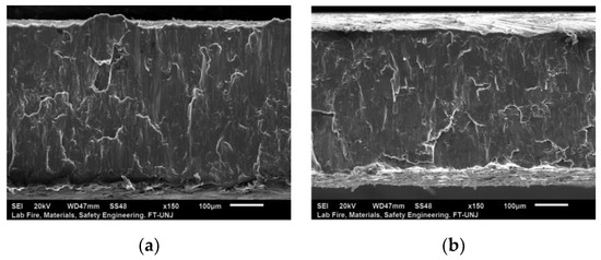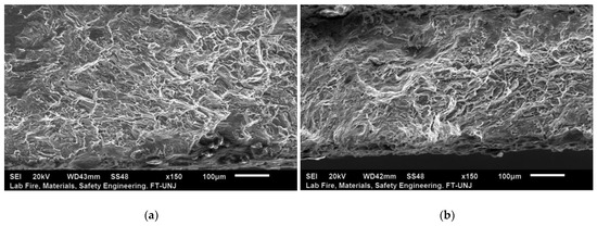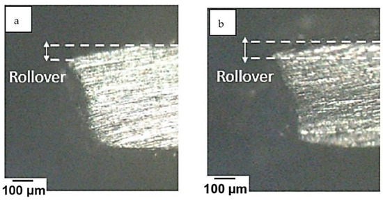 The observations of the fracture in ECAP two-pass and annealed ECAP two-pass shortly after fracture formation at a punch depth of 0.17 mm (30% thickness) are shown in Figure 16. It can be observed that the surface of the ECAP two-pass fracture forms a smooth zone with a height of 4% of the plate thickness, resulting from plastic deformation during the blanking process and material displacement prior to fracture.