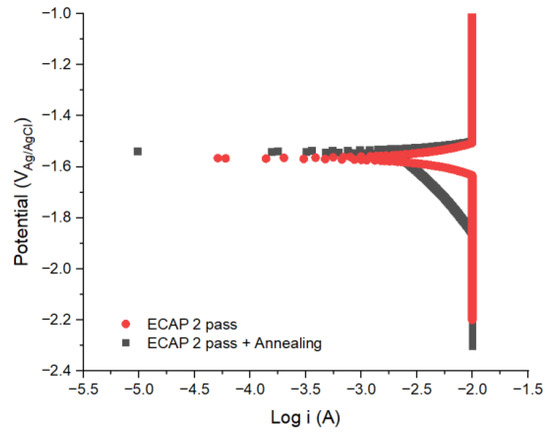 In polycrystalline materials, corrosion tends to preferentially attack grain boundaries. This is because grain boundaries have less perfect atomic structures, resulting in higher energy levels compared to perfect crystals. Additionally, grain boundaries are prone to impurities. Corrosion testing on ECAP specimens was conducted using the potentiodynamic polarization method. The polarization curves of ECAP two-pass before and after annealing are shown in Figure 13. By correlating the grain size after the annealing process, smaller grain sizes exhibited increasing corrosion resistance compared to the others. However, the corrosion rate is not solely determined by grain size but also by crystallographic orientation.
