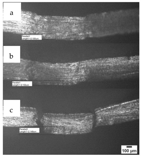The subsequent stage involved the testing phase in microforming, where the specimens underwent conditioning through the ECAP and annealing process. Figure 14 illustrates the deformation occurring during the blanking process of ECAP two-pass magnesium with a punch length function. At a punch depth of 10–20%, as shown in Figure 14a,b, plastic deformation equivalent to 10% of the plate thickness occurs. Subsequently, as the force exerted by the machine continues to increase, fracture occurs at a punch depth of 30%, as depicted in Figure 14c.