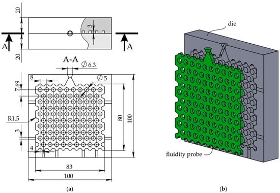 The die for fluidity determination was developed and machined from two plates of 5251 aluminum alloy. Die configuration and dimensions are presented in Figure 1. The die has two halves with two locating pins on one half (not shown in the figure). The die cavity that formed a fluidity probe is located in one half. The probe is a 3 mm thick plate 80 × 83 mm2 with 90 perforations 5 mm in diameter. As shown in Figure 1, the wax entered through the gate with a cross-section of 9.5 mm2 and spread via three narrow passages with the 3 × 3 mm2 area to fill the fluidity pattern. The die cavity perimeter has narrow flat channels for air escape.