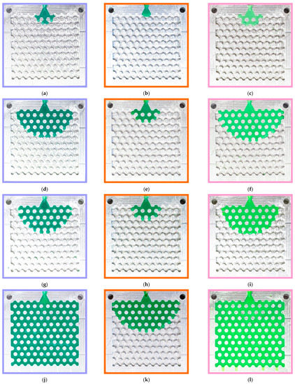 Figure 2 shows the typical fluidity probes of RG20, S1235, and S1135 waxes after injection. It can be seen that the change in injection pressure and temperature have a beneficial influence on the fluidity of waxes under investigation. The probe is well fitted to the chosen gap of injection pressures and temperatures due to the percent of die filling varying from close to zero to full (100%). Also, it was established that the probes obtained in the same conditions look amazingly the same. This behavior is very different from the fluidity test of metallic alloys. The possible reason for the excellent reproducibility of fluidity obtained by the developed wax fluidity test is in the calm flow of the wax in the die channels due to the barrier effect of the pins in the die that break the flow and decrease wax velocity. Also, the increasing wax viscosity with decreasing temperature positively influences test pattern reproducibility. Following the obtained results, the shape of the filling front is a semicircle in most cases. But when the die was filled for more than 50%, and the side walls were filled, the shape of the front was flat (not provided in Figure 2).
