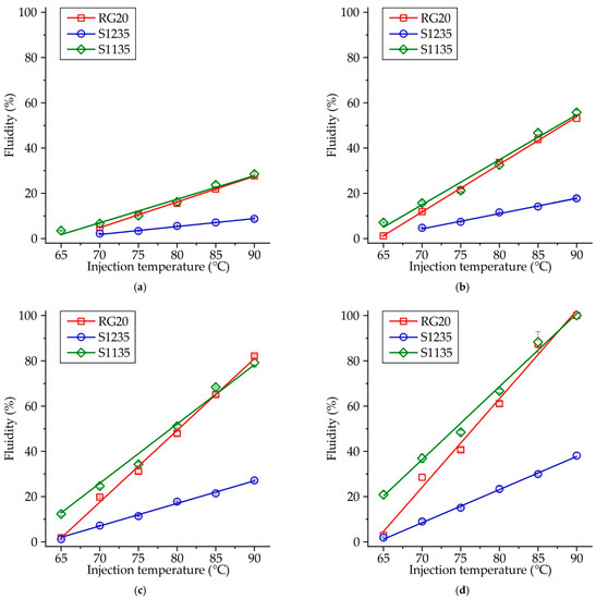 The fluidity at the same injection conditions is not the same for waxes under investigation due to their different composition. Figure 5 shows the influence of injection temperature on the fluidity of RG20, S1235, and S1135 waxes at constant injection pressure. When the injection pressure is low (P = 49 kPa, Figure 5a), the fluidity of RG20 and S1135 waxes is nearly the same, but the fluidity of S1235 wax is almost three times lower. For example, at an injection temperature of 90 °C, the fluidity of RG20, S1235, and S1135 waxes are 27.7, 8.7, and 28.4%. However, with the increasing injection pressure (Figure 5b–d), the difference between the fluidity of RG20 and S1135 waxes is observed at low injection temperatures (60–70 °C). The fluidity of mentioned waxes is near the same for high injection temperatures (80–90 °C). Interestingly, at an injection temperature of 65 °C and injection pressure of 196 kPa, a very low fluidity (<3%) is observed for RG20 and S1235 waxes. Conversely, the S1135 wax shows more than seven times greater fluidity of 20.8%. The lowest fluidity in all conditions is observed for S1235 wax. For instance, at injection temperature and pressure of 90 °C and 196 kPa, respectively, the fluidity of RG20 and S1135 waxes is 100%, but the fluidity of S1235 wax is only 38.1% (Figure 5d).