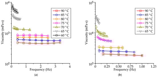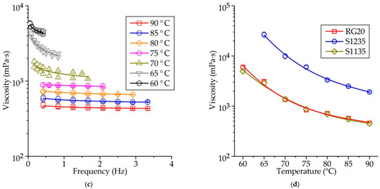 The mean values of dynamic viscosity calculated for all spindle rotation frequencies for RG20, S1235, and S1135 waxes are shown in Figure 6d. It can be seen that the wax viscosity increases with decreasing temperature. For example, the viscosity of RG20 wax at temperatures of 90, 80, 70, and 60 °C are 462, 715, 1349, and 5973 mPa·s, respectively. Thus, when the temperature decreased from 90 to 60 °C, the viscosity of RG20 increased 13 times. For S1235 and S1135 waxes in mentioned temperature range, the viscosity increased by 11–14 times.