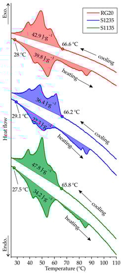 Figure 7 presents the second run heating and cooling DSC curves of RG20, S1235, and S1135 waxes. The liquidus and solidus temperature of the waxes under investigation is very close and in the range of 65.8–66.6 °C and 27.5–29.1 °C, respectively. Thus, the freezing range of the waxes is near the same and close to 38 °C. The long freezing range of the investigated waxes is because the waxes are mixtures of compounds that solidify over a temperature range and contain a wide range of molecular weights [24]. The 3–4 peaks of heat release are observed when the wax is solidified. It is known that the wax is very polydisperse, and molecules of different molecular weights attempt to crystallize at different temperatures [9]. Also, the wax is a multi-component mixture, and the components of the mixture can crystallize at different temperatures. The same situation can be seen for heating curves because of the melting of crystalline fractions with different molecular weight distributions [10]. Also, the transition of one crystalline phase into another, a so-called solid–solid transition, is typical for waxes. As for transition enthalpy calculated via DSC curves, the enthalpy of solidification for RG20, S1235, and S1135 waxes was 42.9, 36.4, and 47.8 J·g−1, respectively.