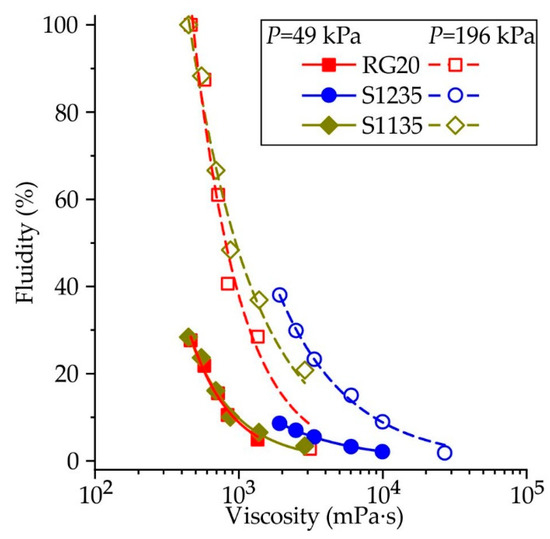 The influence of RG20, S1235, and S1135 waxes viscosity on its fluidity at different injection pressures. Each fluidity point corresponds to the viscosity at the same temperature.