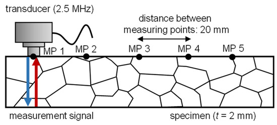 The ultrasound measurements were carried out using an Elcometer© FD800DL+ fault detector. Figure 2 depicts the general measurement setup schematically. The ultrasonic transducer was placed on the specimen with a contact fluid (UltraSoniX™, Echo Ultrasonics®, Bellingham, WA, USA). The contact pressure of the transducer was kept constant at 5 N. The ultrasonic frequency emitted by the transducer was 2.5 MHz. A total of 5 measurements were performed per measuring point. For each specimen, 5 different measurement points were placed across the cross-section with a distance of 20 mm. The measuring points were evenly distributed over the sample cross-section to measure as large a sample volume as possible. The distance between the measuring points was chosen so that the measuring areas did not overlap. The ultrasonic velocity v was determined based on the pulse-echo technique. If the sample thickness t is known and the time of flight (TOF) s is measured, the speed of the ultrasonic can be determined according to Equation (3) [28]. Knowing the ultrasonic velocity of the material, a damage parameter D can then be determined by comparing the initial condition with the cold-rolled conditions, cf. Equation (1).