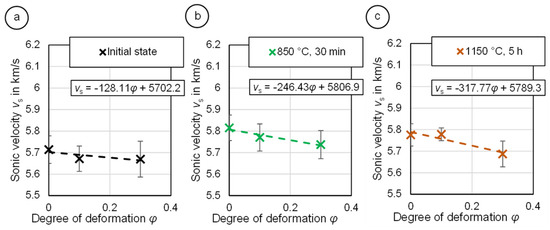 Evolution of the sonic velocity vs. the degree of deformation: (a) initial condition, (b) 850 °C, 30 min, (c) 1150 °C, 5 h.