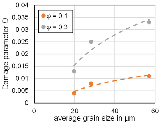 Figure 4 depicts the relationship between the calculated damage parameters and the grain size. A logarithmic increase in the damage parameter with increasing grain size can be seen for both forming degrees. This correlation is consistent with previous studies on the influence of grain size on ultrasonic velocity [32]. However, it indicates that the grain size must be taken into account when determining the damage parameter.