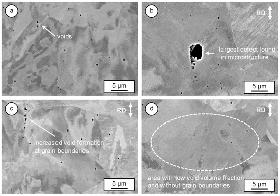 SEM images of the microstructure for void analysis, rolling direction (RD) marked in the figures: (a) initial condition, (b) 1150 °C, 5 h, φ = 0.3, (c) initial condition, φ = 0.3 with increased void formation at grain boundaries, (d) 1150 °C, 5 h, φ = 0.3 with areas with low void volume fraction.