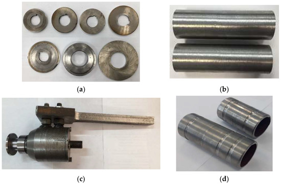 Photos of the rotary tool, workpiece, and cup cutters used in the pre-processing process: (a) cup cutters (R6M5); (b) workpieces from bar Ø50 mm (Steel 45); (c) rotary tool; (d) workpieces from thick-walled pipe Ø72 mm (Steel 20Cr).