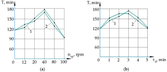 Graphs of dependence of the durability period of cup cutters on the regimes of pre-processing: (a) graphs as a function of spindle speed; β = 100; S = 0.81 mm/rev; t = 0.5; τd = 3 min; (b) graphs as a function of durability time of cup cutters as a function of the duration of the preliminary break-in; 1—during processing steel 45; 2—during processing steel 20Cr; nsp = 40 rpm; β = 100; S = 0.81 mm/rev; t = 0.5.