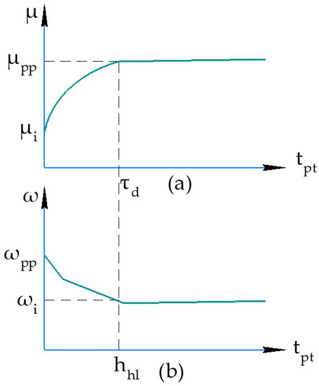 Hypothetical kinematic characteristics of the tool pre-processing operation: (a) change of chemical potential; (b) presentation of wear intensity; μi, μpp—values of chemical potentials of initial and secondary contact structure; τd—duration of running-in period; hhl—thickness of hardened layer; tpt—processing time; ωi and ωpp—represent wear intensity of initial and running-in contact structure.
