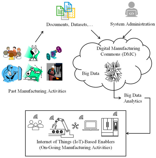 As seen in Figure 1, BD and BDA are valuable constituents of cyber–physical systems of smart manufacturing [28]. In this scenario, Digital Manufacturing Commons (DMCs) [29,30,31,32,33] integrate the cyber and physical spaces. As seen in Figure 1, different stakeholders (producers, designers, planners, and customers) ubiquitously produce various content such as numerical datasets, digital artifacts (e.g., CAD data), metadata, executable/scripted codes, machine performance statistics, models, algorithms, etc. One example of such content is manufacturing process-relevant documents, such as scientific articles containing process-relevant information and data published in several journals and conference proceedings, as shown in Figure 2. These contents are converted into a widely accessible digital format, resulting in DMCs [32]. These commons (DMCs) are then stored in a repository called the digital marketplace. The remarkable thing is that the digital marketplace exhibits the Vs of BD described above and acts as BD. Thus, BDA must be installed in the digital marketplace [32]. As such, BDA can operate on DMCs and extract the required knowledge. The extracted knowledge helps run the IoT-embedded manufacturing enablers (robots, machine, tools, processes, and different planning systems).