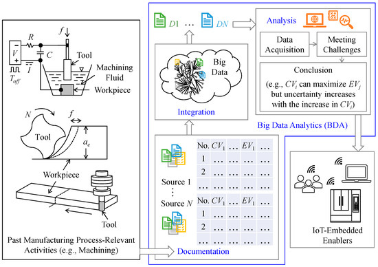 As far as smart manufacturing is concerned, CV–EV-centric past experimental and analytical documents from different sources populate the DMCs and generate process-relevant BD, as described in Section 1 (can also be seen in Figure 1). For this, BDA is a must to extract knowledge from these commons (DMCs) and functionalize optimization of the relevant manufacturing processes. However, in the literature (described in Section 2), no unified framework is found elucidating the systems architecture for developing such BDA. The presented BDA architectures mostly adapt AI-based ML/deep learning algorithms (e.g., CANN, GA, DBNN, etc.) and result in opaque/black-box systems [27,55,56].